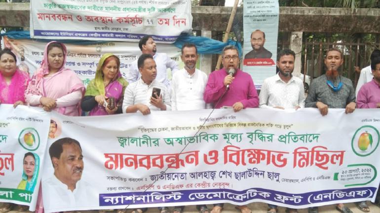 বুধবার (১০ আগস্ট) বেলা ১১টায় জাতীয় প্রেস ক্লাবের সামনে আয়োজিত এক মানববন্ধনে তিনি এসব কথা বলেন। জ্বালানি তেলের দামবৃদ্ধির প্রতিবাদে ন্যাশনাল পিপলস পার্টি (এনপিপি) ও এর নেতৃত্বাধীন জোট এনডিএফ মানববন্ধনটির আয়োজন করে।
