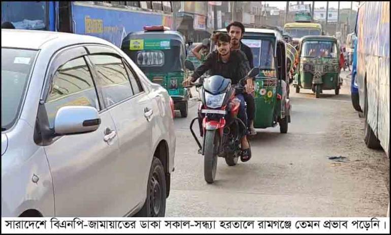সারাদেশে বিএনপি-জামায়াতের ডাকা সকাল-সন্ধ্যা হরতালে রামগঞ্জে তেমন প্রভাব পড়েনি। বিএনপি ও জামায়াতের ডাকে ঢাকা মহানগরে হরতাল চললেও রামগঞ্জ থেকে দুরপাল্লার কোন যানবাহন চলাচল করেনি। সকাল থেকে ঢাকা-চট্টগ্রাম বা চৌমুহুনী ও নোয়াখালীগামী বাস কাউন্টার ছিলো বন্ধ। ছেড়ে যায়নি কোন গণপরিবহন। বেলা বাড়ার সাথে সাথে ব্যাটারী ও সিএনজি চালিত অটোরিক্সার পাশাপাশি, পিকআপ ও মালবাহী পরিবহন চলাচল ছিলো স্বাভাবিক। তবে লক্ষ্মীপুর-হাজীগঞ্জ ও চৌমুহুনী-মাইজদিগামী বাস এবং সিএনজি বন্ধ থাকায় যাত্রী সাধারণ পড়েন মারাত্মক দূর্ভোগে।