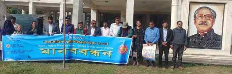 উপজেলা পরিষদ চত্তরে মানববন্ধন শেষে পরিষদ হল রুমে আলোচনাসভা অনুষ্ঠিত হয়।
