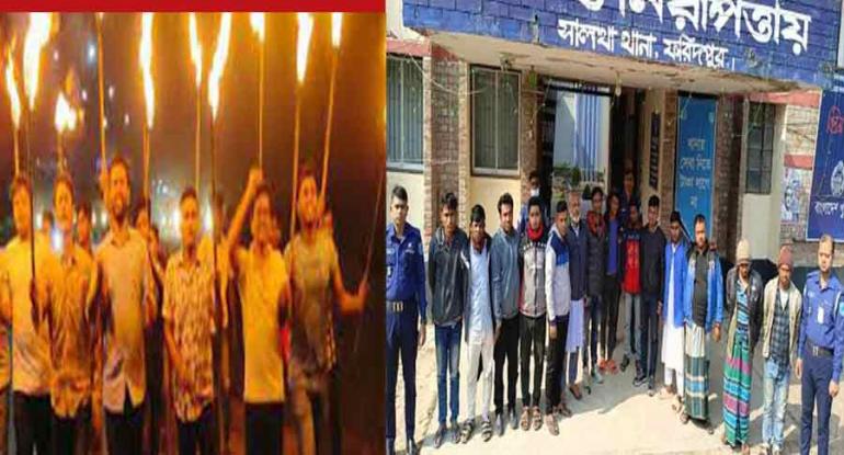 এর আগে রবিবার রাত ৯ টার দিকে উপজেলার গট্টি ইউনিয়নের মাদরাসা মোড়ের চালতাতলা এলাকার সালথা-ফরিদপুর সড়কে এ মশাল মিছিল বের করা হয়। খবর পেয়ে পুলিশ ঘটনাস্থলে গিয়ে মিছিলটি ছত্রভঙ্গ করে দেয়। এ সময় মিছিল থেকে বিএনপি ও তার সহযোগী সংগঠনের ১১ নেতাকর্মীকে গ্রেপ্তার করে পুলিশ।