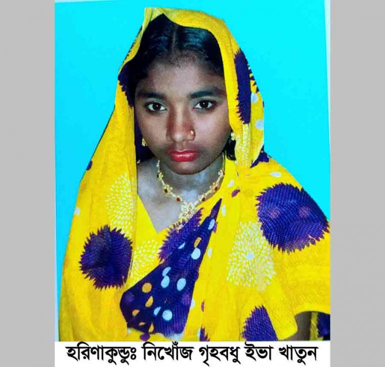 ঝিনাইদহের হরিণাকুন্ডুতে চল্লিশ দিন ধরে ইভা খাতুন (২০) নামে এক গৃহবধূ নিখোঁজ রয়েছেন। গত বছরের ২৭ ডিসেম্বর হরিণাকুন্ডুর কুলবাড়িয়া গ্রামের শ^শুর বাড়ি থেকে তিনি নিখোঁজ হন। এ ঘটনায় হরিণাকুন্ডু থানায় একটি লিখিত অভিযোগ দায়ের করেছেন নিখোঁজ ইভা খাতুনের পিতা আলমগীর হোসেন। ইভা খাতুন একই উপজেলার কুলবাড়িয়া গ্রামের তরিকুল ইসলামের স্ত্রী। লিখিত জিডি সূত্রে রোববার জানা গেছে, গত ২৭ ডিসেম্বর ভোরে শ্বশুরবাড়ি থেকে কোথাও বের হয়ে আর ফিরে আসিননি ইভা। বিভিন্ন জায়গায় খোঁজ খবর নিয়ে মেয়েকে না পেয়ে পুলিশের দ্বারস্থ হন তার পিতা আলমগীর। তিনি জানিয়েছেন, নিখোঁজের চল্লিশ দিন পার হলেও মেয়ের কোন হদিস নেই। বিষয়টি নিয়ে পরিবারের সদস্যরা শংকার মধ্যে আছে।